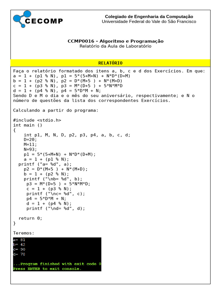 Faça o relatório formatado dos itens a, b, c e d dos Exercícios. Em que: