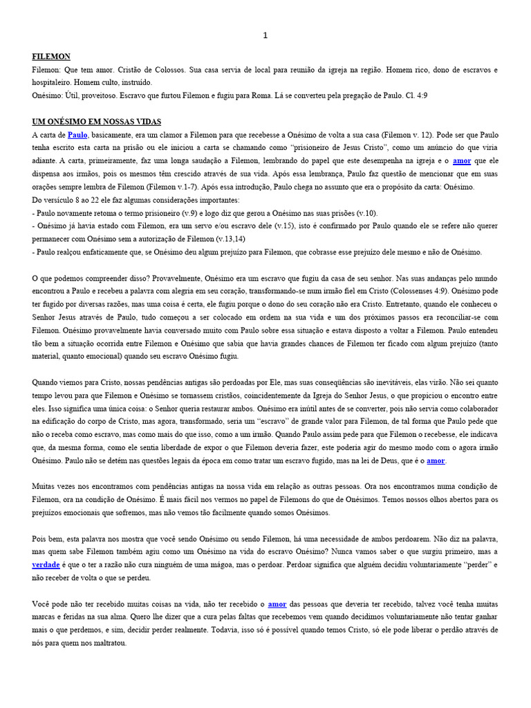 Pois bem, esta palavra nos mostra que você sendo Onésimo ou sendo Filemon, há uma necessidade de ambos perdoarem. Não diz na palavra,