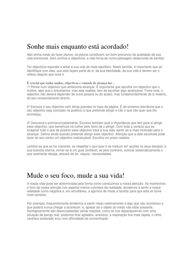 seu objectivo seja colocado na positiva (o que pretende atingir e não o que não quer que lhe