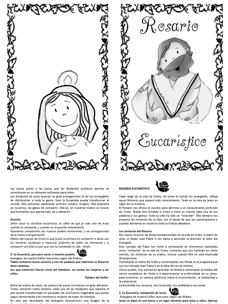 ROSARIO EUCARSTICO Cada rasgo de la vida de Cristo, tal como lo narran los evangelios, refleja aquel Misterio que supera todo conocimiento. Todo en la vida de Jess es signo de su misterio. El Rosario nos ofrece el secreto para abrirnos a un conocimiento profundo de Cristo. Mara vive mirando a Cristo y tiene en cuenta cada una de sus palabras y sus gestos. Toda su vida ha sido un recordar. Ella siempre nos propone los misterios de su Hijo, con el deseo de que los contemplemos y puedan derramar en nosotros toda su fuerza salvadora. Los misterios del Rosario Nos hacen recorrer las lneas fundamentales de la vida de Cristo. A partir de ellos, el Beato Juan Pablo II nos llama a extender la atencin al resto del Evangelio. Este consejo del Papa nos invita a contemplar en momentos especiales otros misterios de la vida de Cristo, misterios que son tambin en cierto sentido, los misterios de su madre, incluso cuando Ella no est implicada directamente. Contemplar el rostro de Cristo y contemplarlo con Mara es el programa que nos ha indicado Juan Pablo II en el alba del tercer milenio. Como pueblo, hoy queremos aprender de Mara a contemplar la belleza del rostro eucarstico de Cristo y a experimentar la profundidad de su amor, para encontrar un camino autntico hacia la reconciliacin, la solidaridad y la coherencia. La Eucarista nos convoca, nos reconcilia, nos solidariza y nos enva. 1. La Eucarista, compasin de Jess. Evangelio de nuestro Seor Jesucristo segn san Mateo: Jess se alej en una barca a un lugar desierto para estar a solas. Apenas lo supo la gente, dej las ciudades y lo sigui a pie. Cuando desembarc, Jess vio a una gran muchedumbre y, compadecindose de ella, cur a los enfermos. Palabra del Seor. Jess contempla a la muchedumbre. Se compadece de ella porque eran como ovejas sin pastor. La imagen es elocuente. Son hombres y mujeres indefensos, en peligro, sin nadie que las conduzca, sin proteccin y sin alimento. En esta escena vemos