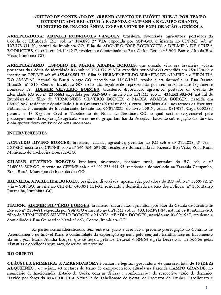 Inaciolândia, Estado de Goiás, por este contrato e na melhor forma de direito, contrata com o ARRENDATÁRIO