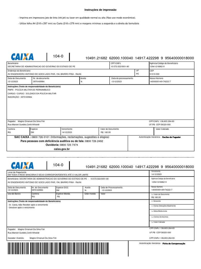 Beneficiário: SECRETARIA DE ADMINISTRACAO DO GOVERNO DO ESTADO DE PE - 10.572.022/0001-80 Agência/Código do Beneficiário