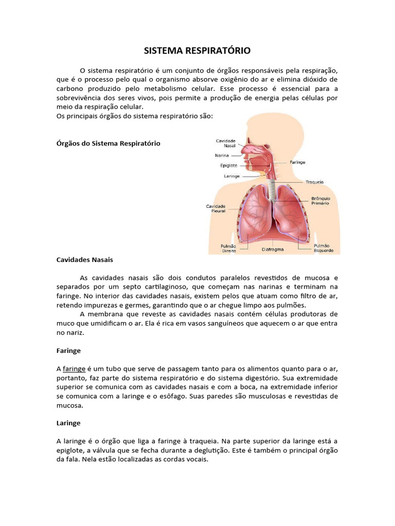 O sistema respiratório é um conjunto de órgãos responsáveis pela respiração,