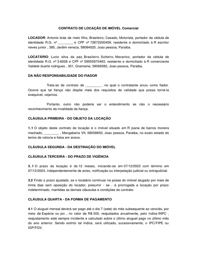 1.1 O objeto deste contrato de locação é o imóvel situado em R joana de barros moreira