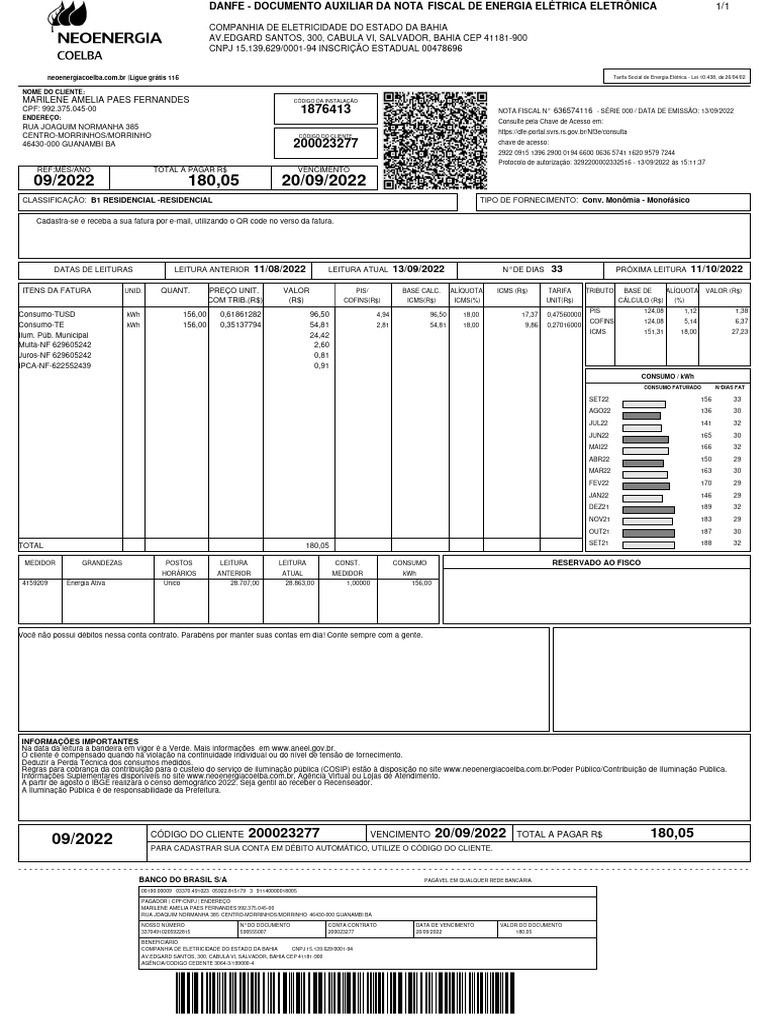 CÓDIGO DO CLIENTE 200023277 VENCIMENTO 20/09/2022 TOTAL A PAGAR R$ 180,05