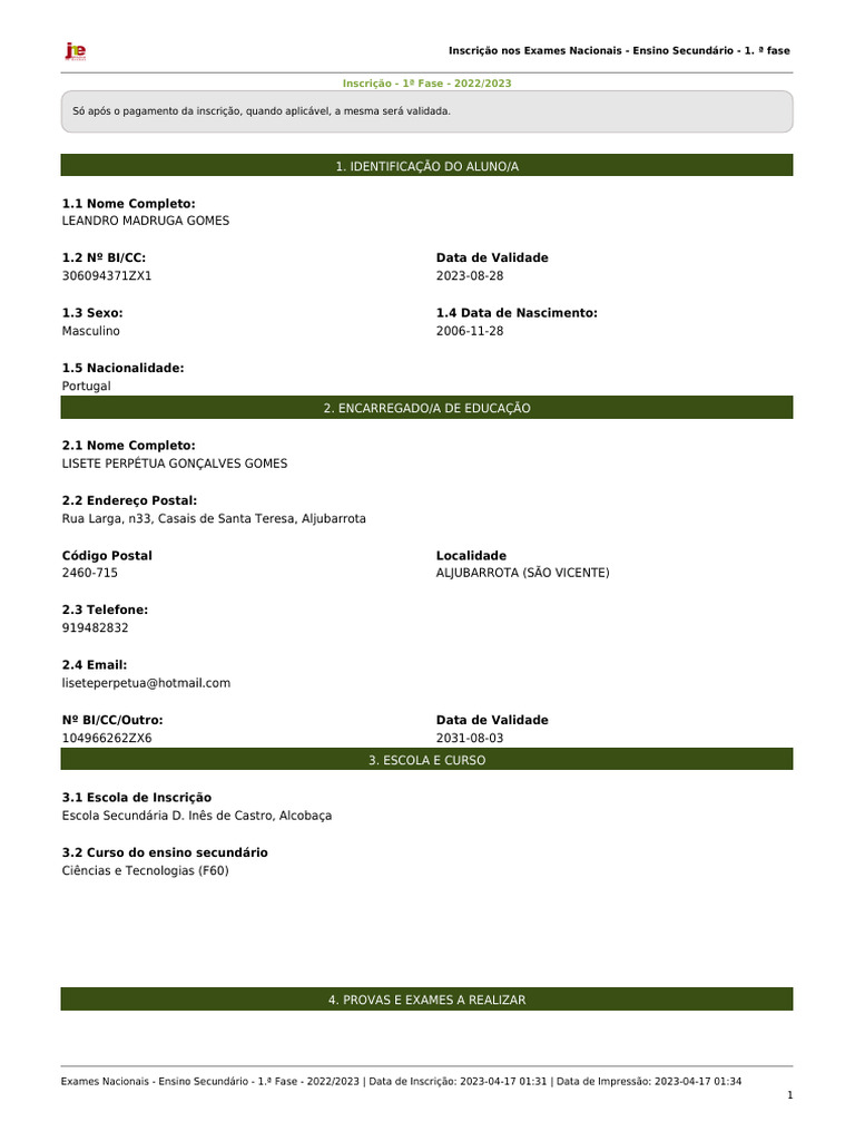 Exames Nacionais - Ensino Secundário - 1.ª Fase - 2022/2023 | Data de Inscrição: 2023-04-17 01:31 | Data de Impressão: 2023-04-17 01:34