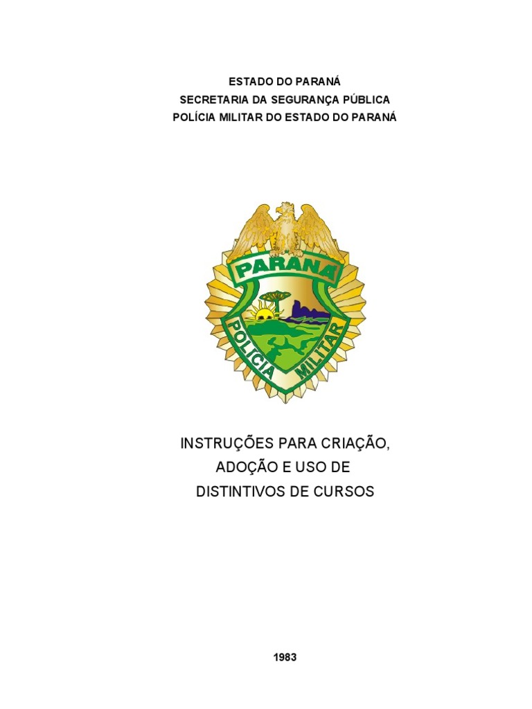 CAPITULO I FINALIDADE Art 1 As presentes Instrues tm por finalidade orientar a criao, a adoo e o uso dos distintivos de cursos, na Polcia Militar do Paran. CAPITULO II GENERALIDADES Art 2 Os Policiais Militares podero usar distintivos de cursos em seus uniformes, ficando excludo o uso de qualquer outro smbolo, na forma aqui estabelecida, referente s outras formas de aprendizado, ensino ou instruo, que no os aqui previstos. Art 3 Distintivos de cursos so smbolos representativos de ciclos de estudos efetuados por Policiais Militares da Corporao em qualquer poca, em estabelecimentos de ensino e so, sempre, caracterstica do grau de profissionalizao de quem os ostenta. Art. 4 Consideram-se ciclos de estudos em estabelecimentos de ensino a que se refere o artigo anterior, os cursos realizados: 1. Na Polcia Militar do Paran. 2. Em outros estabelecimentos: a. em Polcias Militares de outras Unidades da Federao; b. em Corpos de Bombeiros Independentes; c. nas Foras Armadas; d. em estabelecimentos de ensino civil, oficialmente reconhecidos, e e. em estabelecimentos de ensino, civil ou militar, de outras naes. Pargrafo nico. Os cursos da Polcia Militar do Paran, so aqueles institudos, ou que venham a s-lo, na forma da legislao em vigor, e realizados sob os seus auspcios, na prpria Corporao, ou em entidade que com ela mantenha acordo. CAPTULO III DA CRIAO DE DISTINTIVOS Art. 5 Os distintivos sero criados por ocasio da instituio do curso, a sua aprovao se dar imediatamente aps atendida esta formalidade.