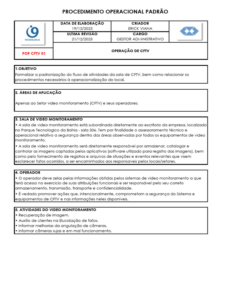 operacional relativo a segurança dentro das áreas observadas por todos os equipamentos de video