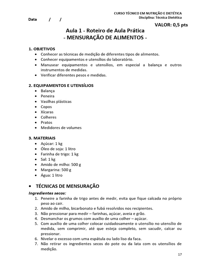 Conhecer as técnicas de medição de diferentes tipos de alimentos.
