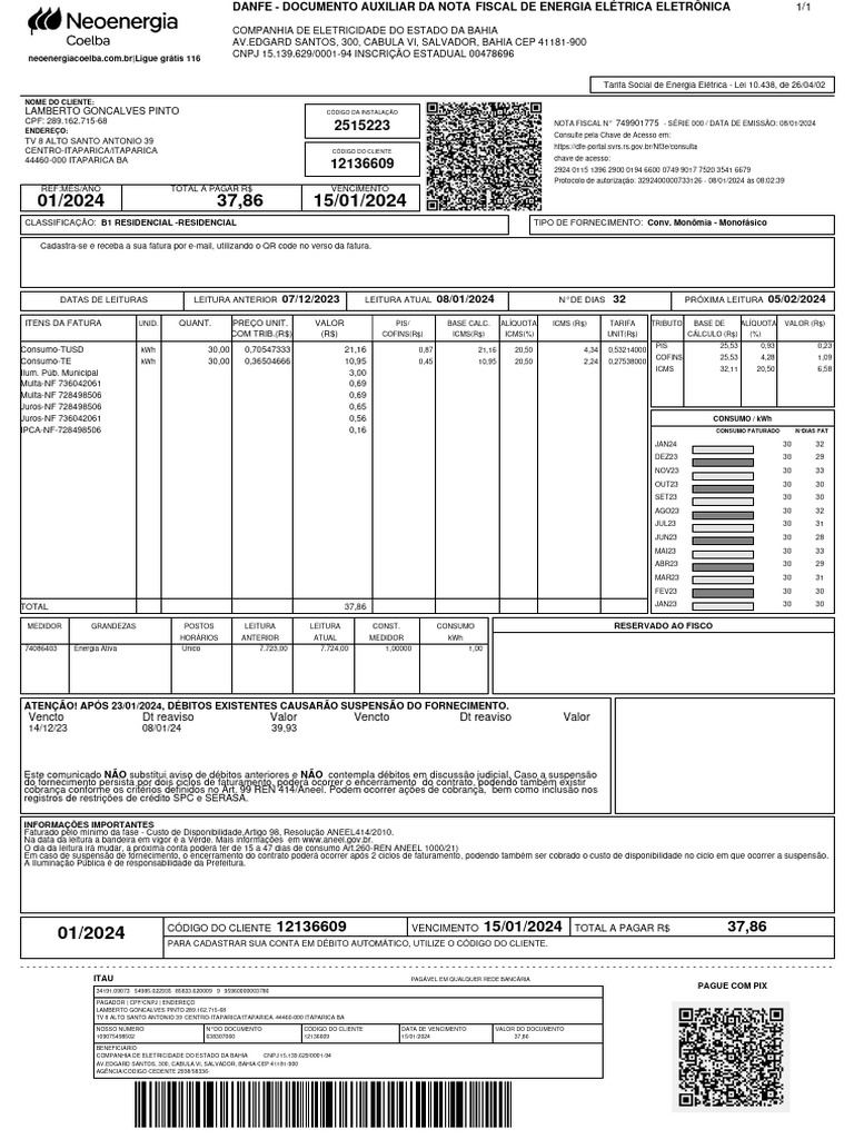 CÓDIGO DO CLIENTE 12136609 VENCIMENTO 15/01/2024 TOTAL A PAGAR R$ 37,86