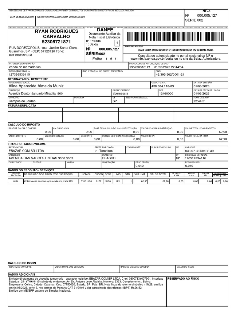 DATA DE RECEBIMENTO IDENTIFICACAO E ASSINATURA DO RECEBEDOR Nº 000.005.127