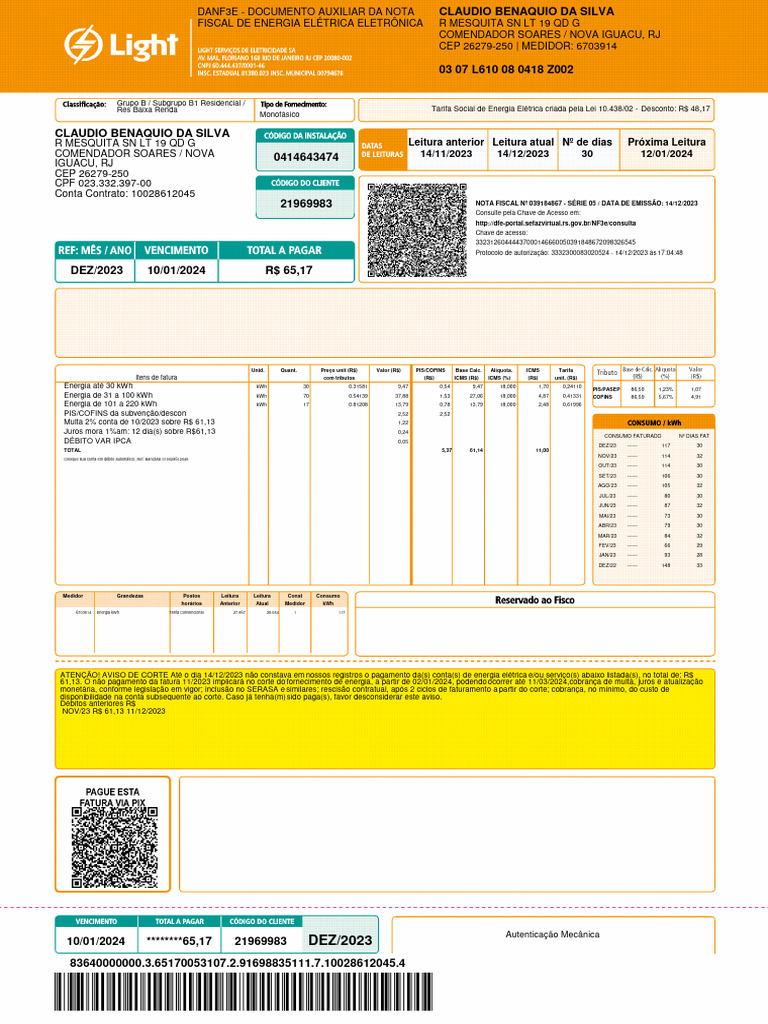 61,13. O não pagamento da fatura 11/2023 implicará no corte do fornecimento de energia, a partir de 02/01/2024, podendo ocorrer até 11/03/2024,cobrança de multa, juros e atualização