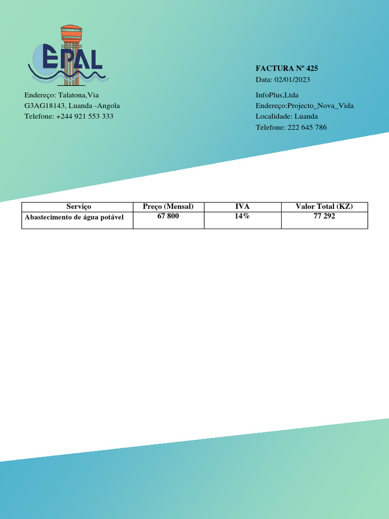 Endereço: Cassenda, Luanda -Angola FACTURA Nº 67