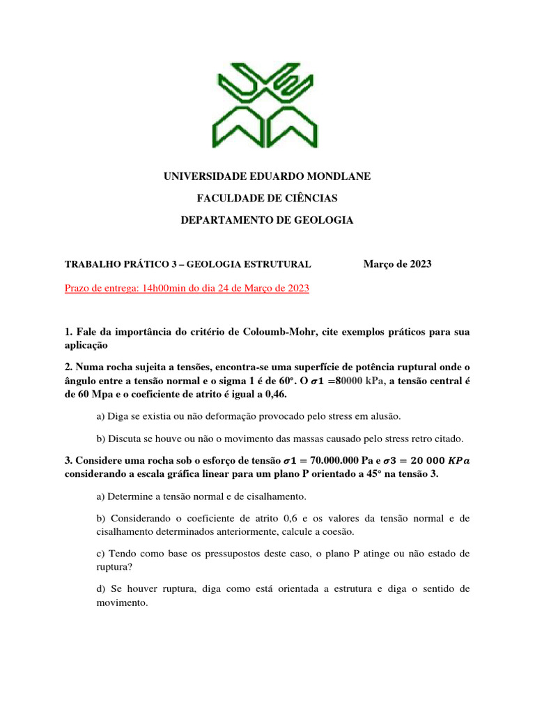 3. Considere uma rocha sob o esforço de tensão 𝝈𝟏 = 70.000.000 Pa e 𝝈𝟑 = 𝟐𝟎 𝟎𝟎𝟎 𝑲𝑷𝒂