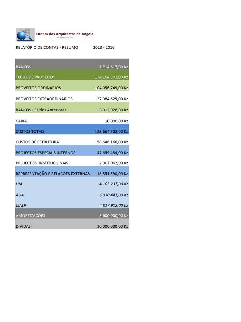 1) O relatório apresenta os totais de contas de 2013 a 2016, com proveitos totais de 134 bilhões de Kz e custos totais de 128 bilhões de Kz.