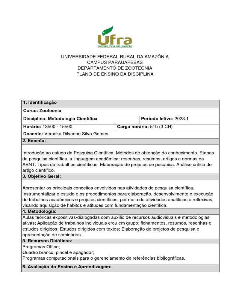 Disciplina: Metodologia Científica Período letivo: 2023.1