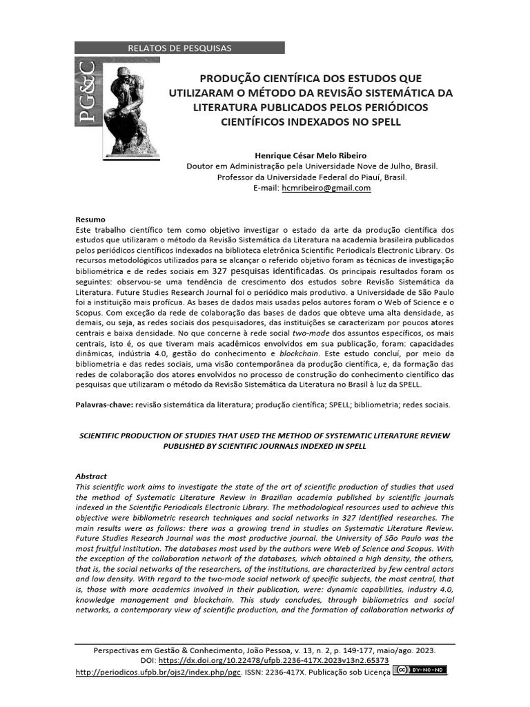 Palavras-chave: revisão sistemática da literatura; produção científica; SPELL; bibliometria; redes sociais.