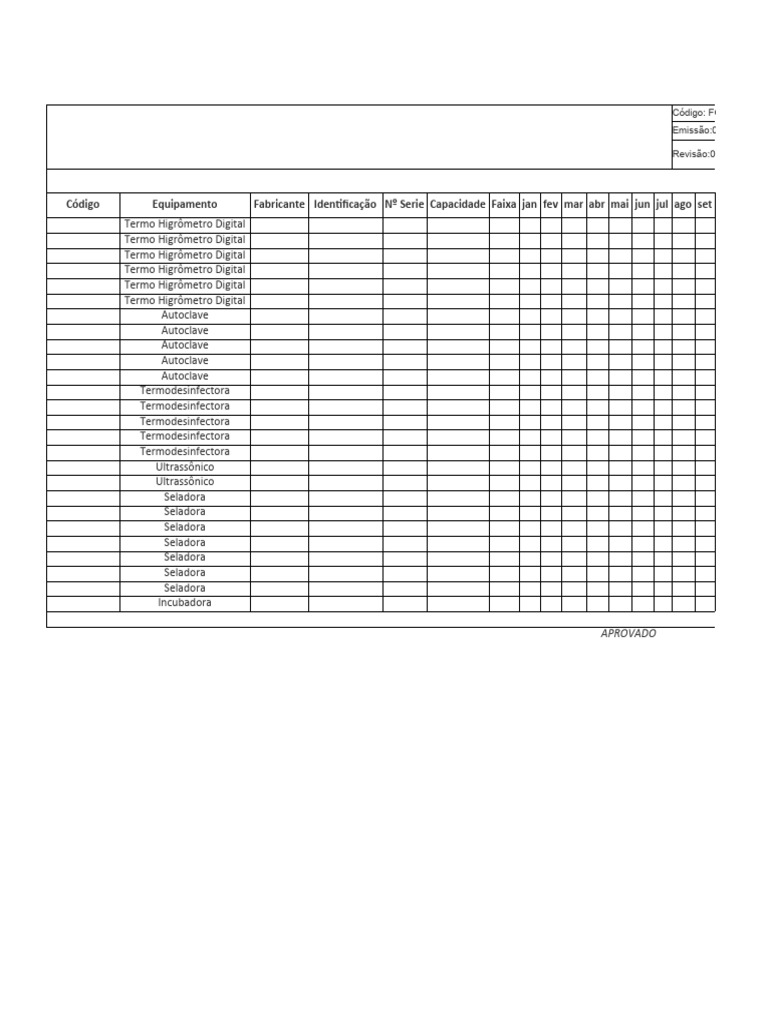 Código Equipamento Fabricante Identificação Nº Serie Capacidade Faixa jan fev mar abr mai jun jul ago set