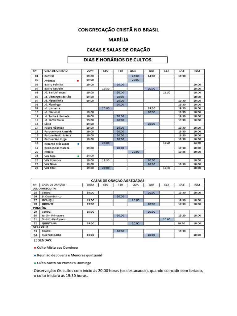 Observação: Os cultos com início às 20:00 horas (os destacados), quando coincidir com feriado,