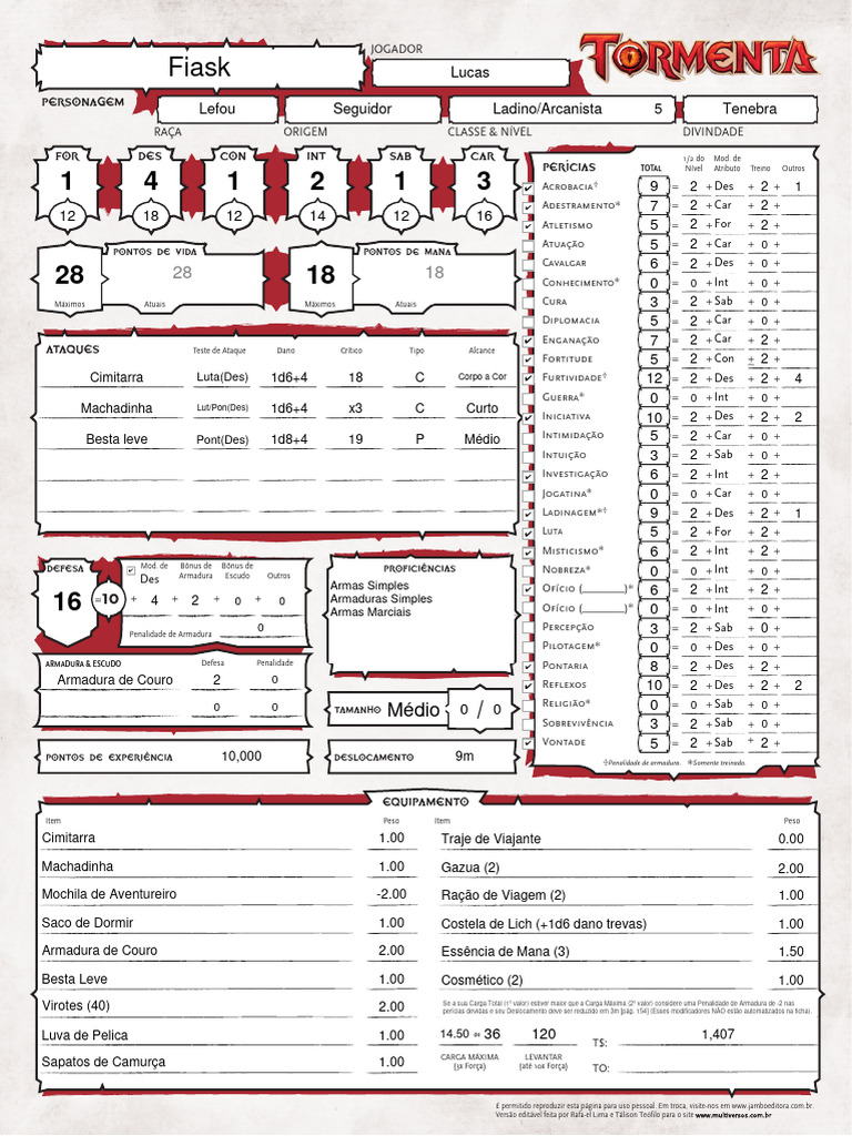 Cimitarra Luta(Des) 1d6+4 18 C Corpo a Cor ✔ Furtividade 12 = 2 + Des