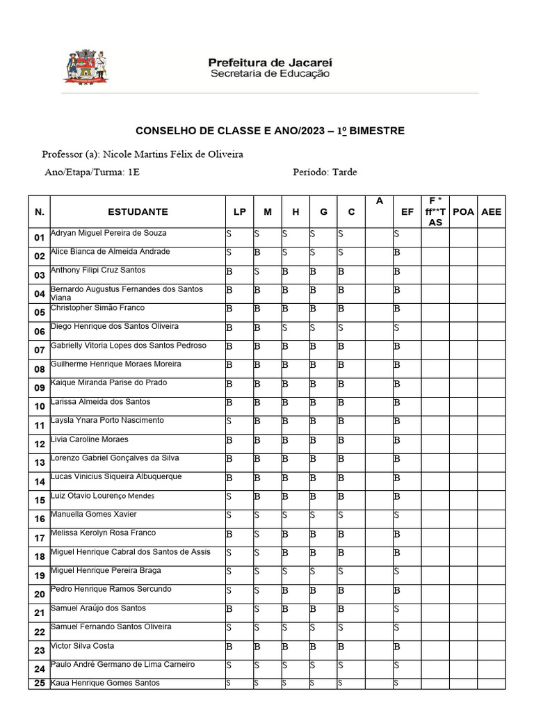 CONSELHO DE CLASSE E ANO/2023 1º BIMESTRE