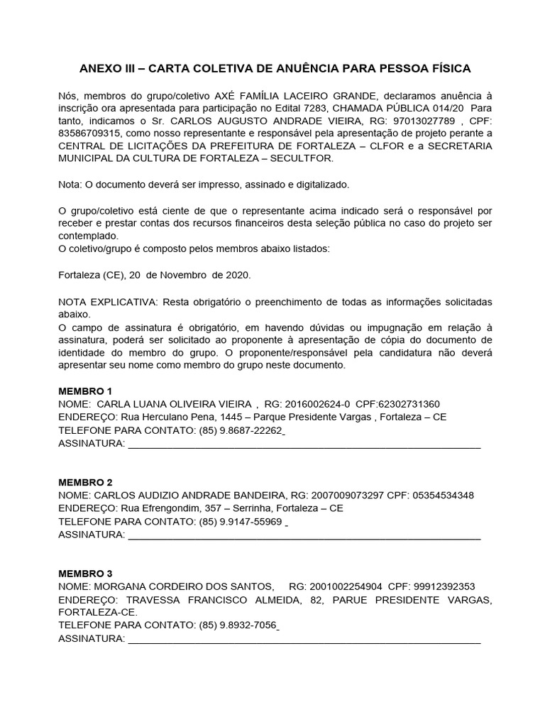 ANEXO III – CARTA COLETIVA DE ANUÊNCIA PARA PESSOA FÍSICA
