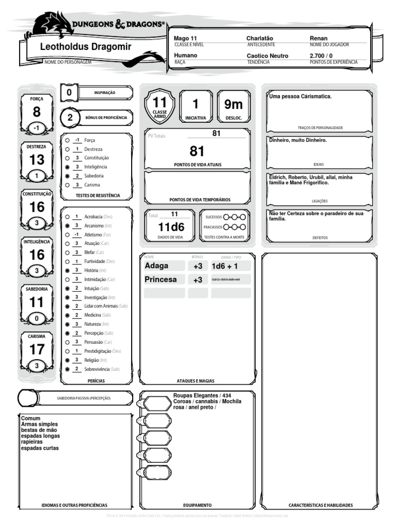 NOME DO PERSONAGEM RAÇA TENDÊNCIA PONTOS DE EXPERIÊNCIA