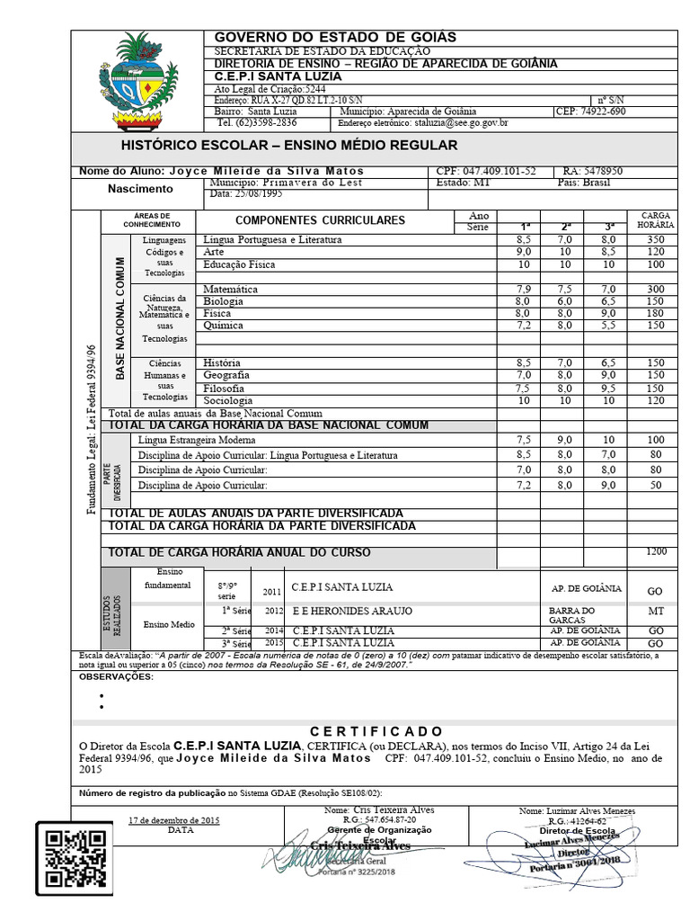 Federal 9394/96, que J o y c e M i l e i d e d a S i l v a M a t o s CPF: 047.409.101-52, concluiu o Ensino Medio, no ano de