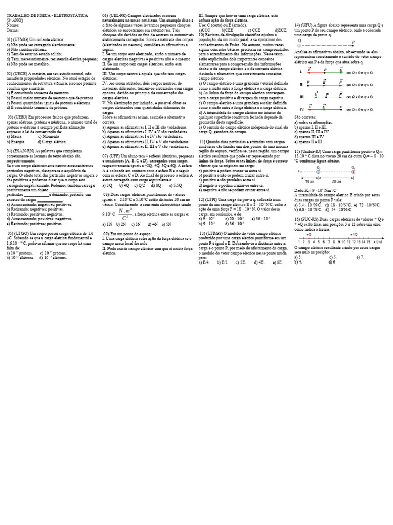 TRABALHO DE FÍSICA - ELETROSTÁTICA 06) (UEL-PR) Campos eletrizados ocorrem III.