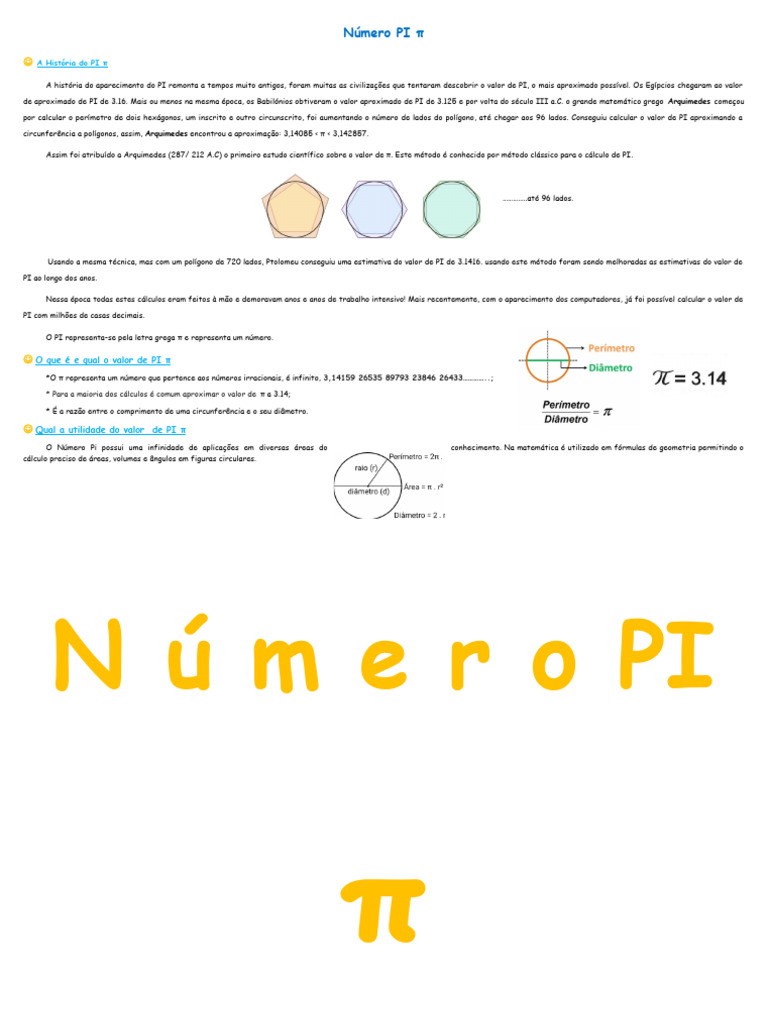Assim foi atribuído a Arquimedes (287/ 212 A.C) o primeiro estudo científico sobre o valor de π. Este