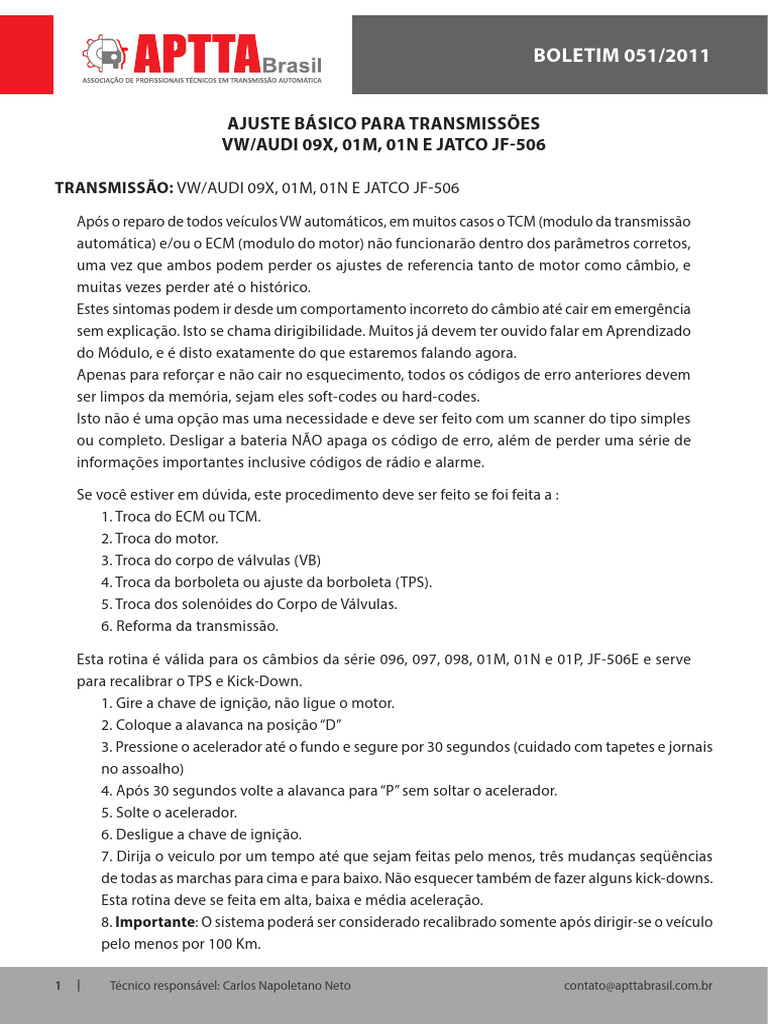 Esta rotina é válida para os câmbios da série 096, 097, 098, 01M, 01N e 01P, JF-506E e serve