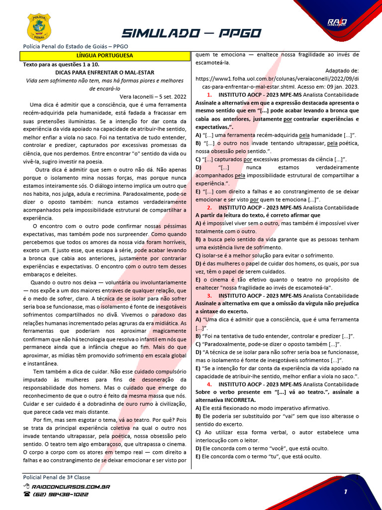 5. INSTITUTO AOCP - 2023 MPE-MS Analista Contabilidade E) Dicas para enfrentar os malestares.