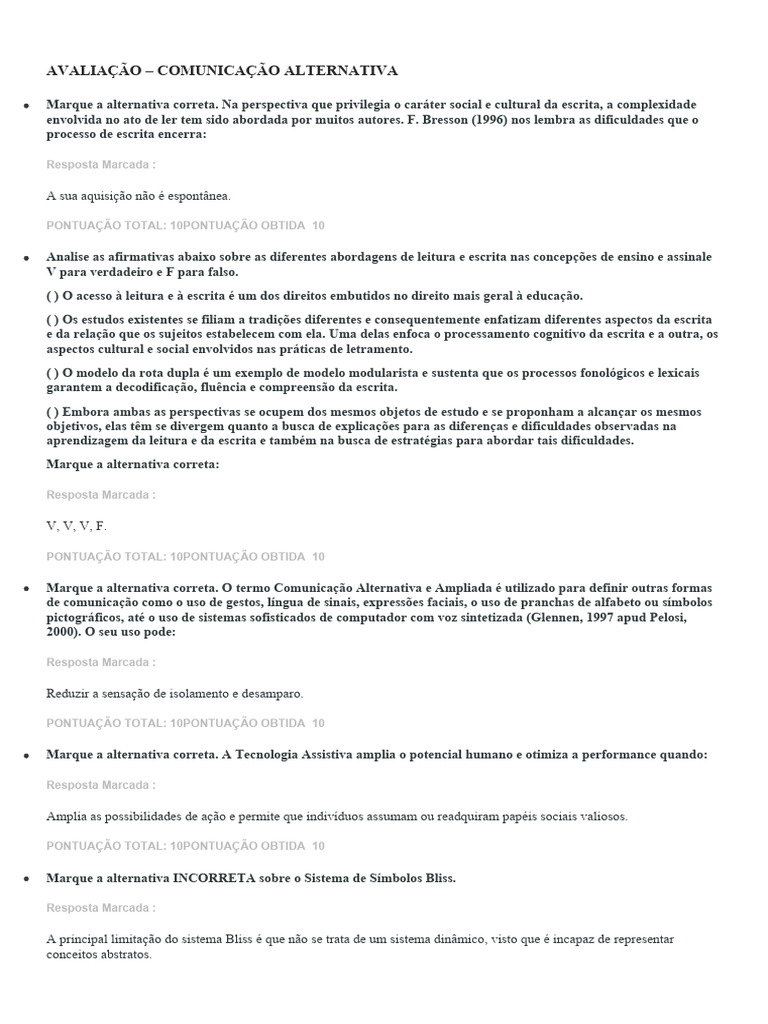 Analise as afirmativas abaixo sobre Comunicação Alternativa e Aprendizagem e assinale V para verdadeiro e F para