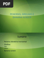 Peneiras com um ou dois eixos, tipo banana e modulares. Geralmente so utilizadas para classicao e lavagem de materiais grossos e semi-grossos com inclinaes variando entre 10 e 22 graus (a faixa mais utilizada de 15 a 20 graus). Normalmente tem movimento circular (opera com a fora da gravidade e por isso, trabalha com frequncias menores).