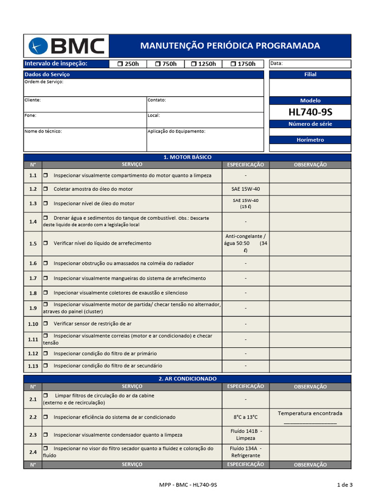 Intervalo de inspeção: r 250h r 750h r 1250h r 1750h Data: