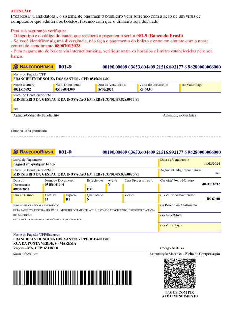 Prezado(a) Candidato(a), o sistema de pagamento brasileiro vem sofrendo com a ação de um vírus de