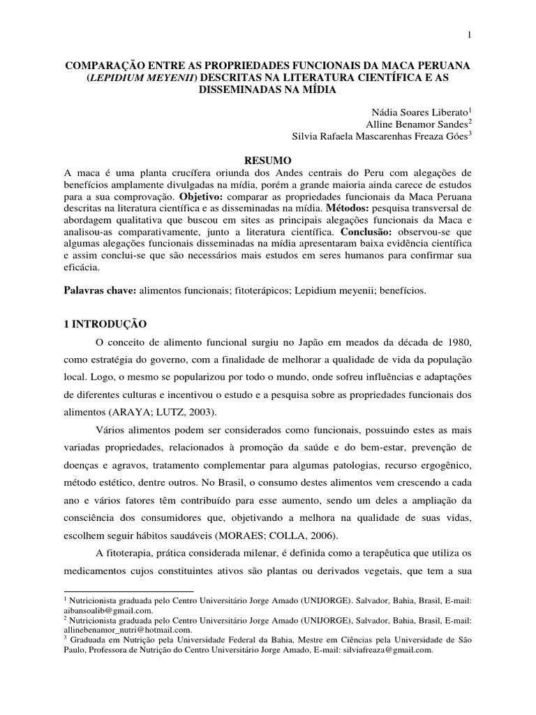alegações de propriedades funcionais da Maca Peruana na mídia eletrônica, e a segunda