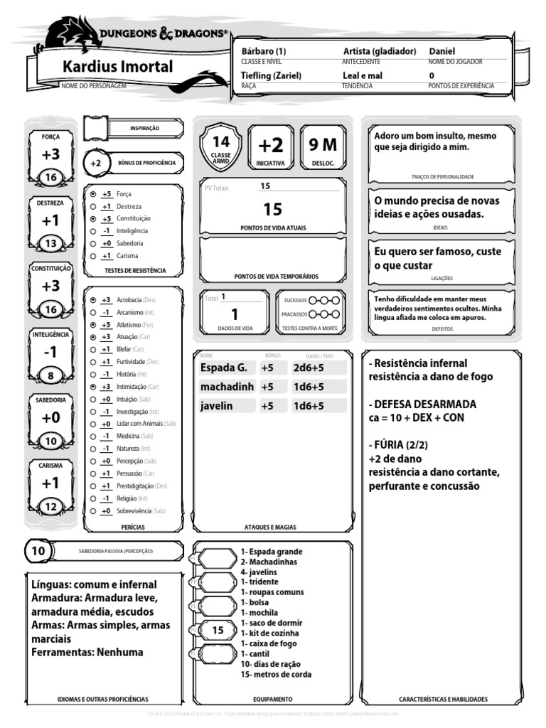 NOME DO PERSONAGEM RAÇA TENDÊNCIA PONTOS DE EXPERIÊNCIA