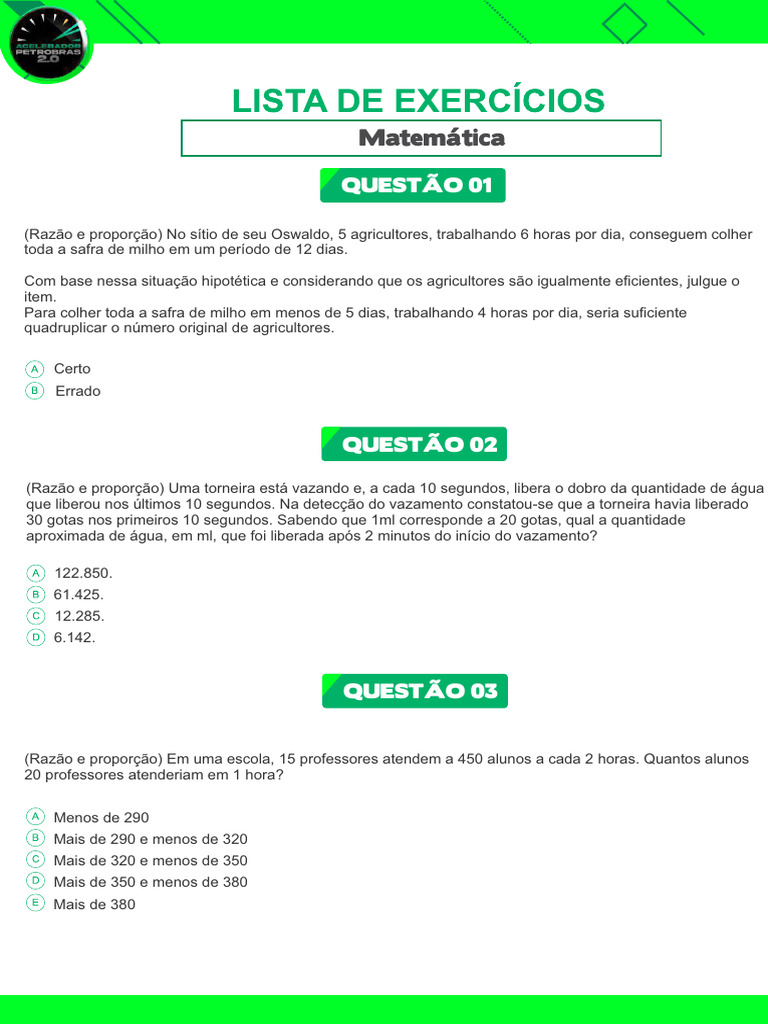 (Razão e proporção) Em uma escola, 15 professores atendem a 450 alunos a cada 2 horas. Quantos alunos