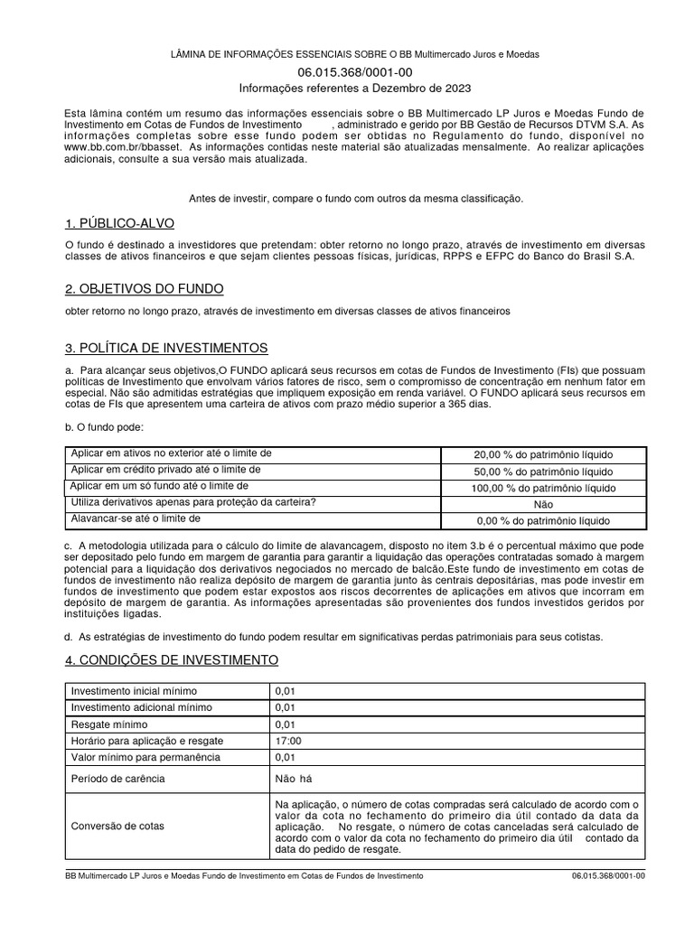 Esta lâmina contém um resumo das informações essenciais sobre o BB Multimercado LP Juros e Moedas Fundo de