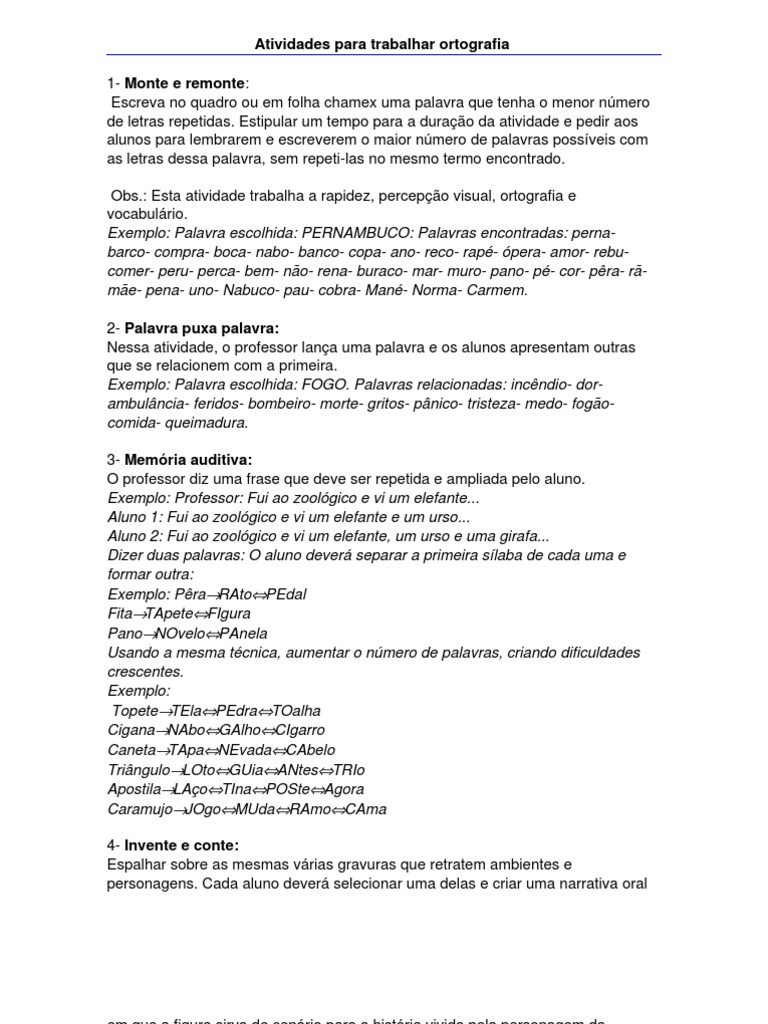nmero de letras repetidas. Estipular um tempo para a durao da atividade e pedir aos alunos para lembrarem e escreverem o maior nmero de palavras possveis com as letras dessa palavra, sem repeti-las no mesmo termo encontrado. Obs.: Esta atividade trabalha a rapidez, percepo visual, ortografia e vocabulrio. Exemplo: Palavra escolhida: PERNAMBUCO: Palavras encontradas: pernabarco- compra- boca- nabo- banco- copa- ano- reco- rap- pera- amor- rebucomer- peru- perca- bem- no- rena- buraco- mar- muro- pano- p- cor- pra- rme- pena- uno- Nabuco- pau- cobra- Man- Norma- Carmem. 2- Palavra puxa palavra: Nessa atividade, o professor lana uma palavra e os alunos apresentam outras que se relacionem com a primeira. Exemplo: Palavra escolhida: FOGO. Palavras relacionadas: incndio- dorambulncia- feridos- bombeiro- morte- gritos- pnico- tristeza- medo- fogocomida- queimadura. 3- Memria auditiva: O professor diz uma frase que deve ser repetida e ampliada pelo aluno. Exemplo: Professor: Fui ao zoolgico e vi um elefante... Aluno 1: Fui ao zoolgico e vi um elefante e um urso... Aluno 2: Fui ao zoolgico e vi um elefante, um urso e uma girafa... Dizer duas palavras: O aluno dever separar a primeira slaba de cada uma e formar outra: Exemplo: PraRAtoPEdal FitaTApeteFIgura PanoNOveloPAnela Usando a mesma tcnica, aumentar o nmero de palavras, criando dificuldades crescentes. Exemplo: TopeteTElaPEdraTOalha CiganaNAboGAlhoCIgarro CanetaTApaNEvadaCAbelo TringuloLOtoGUiaANtesTRIo ApostilaLAoTInaPOSteAgora CaramujoJOgoMUdaRAmoCAma 4- Invente e conte: Espalhar sobre as mesmas vrias gravuras que retratem ambientes e personagens. Cada aluno dever selecionar uma delas e criar uma narrativa oral