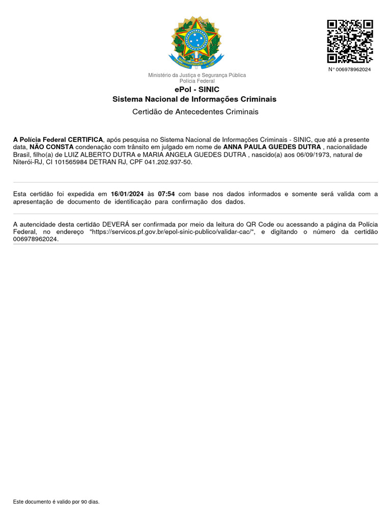 data, NÃO CONSTA condenação com trânsito em julgado em nome de ANNA PAULA GUEDES DUTRA , nacionalidade