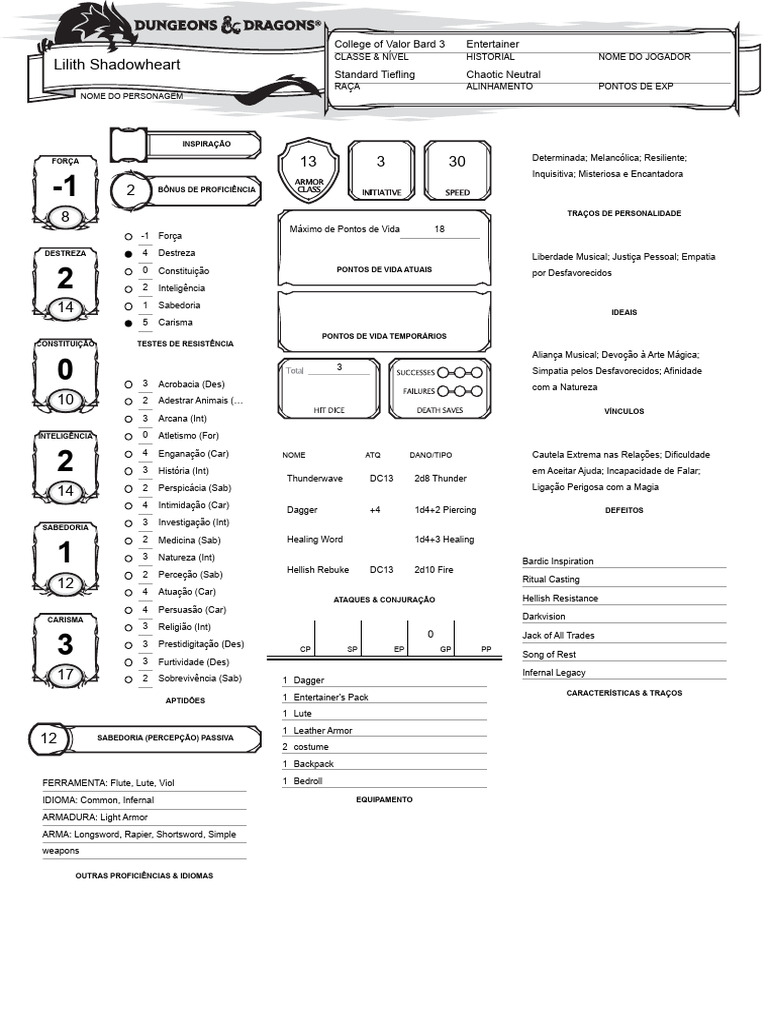 IDIOMA: Common, Infernal EQUIPAMENTO