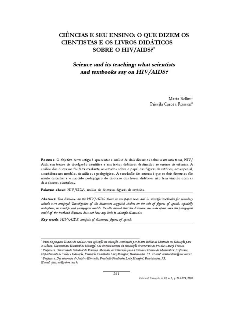 CIÊNCIAS E SEU ENSINO: O QUE DIZEM OS CIENTISTAS E OS LIVROS DIDÁTICOS SOBRE O HIV/AIDS? *