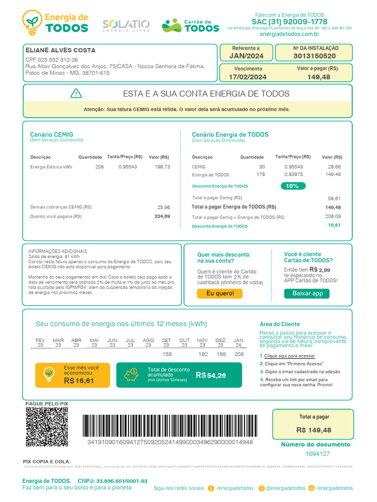 Demais cobranças CEMIG (R$) 25,96 Total a pagar Energia de TODOS (R$) 149,48