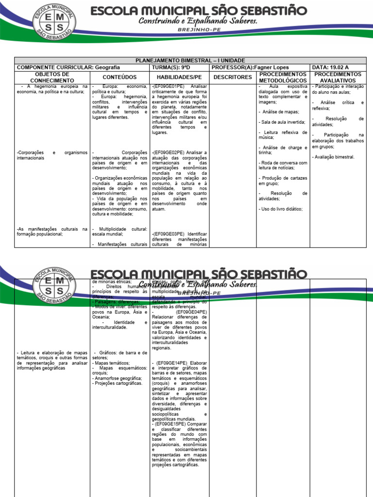 PLANEJAMENTO BIMESTRAL – I UNIDADE