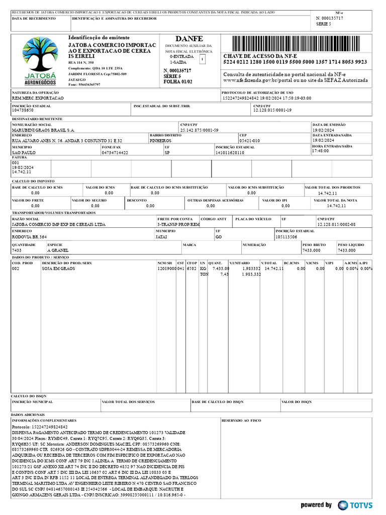 JATOBA COMERCIO IMP EXP DE CEREAIS LTDA 3-TRANSP PROP/REM 12.128.015/0002-08