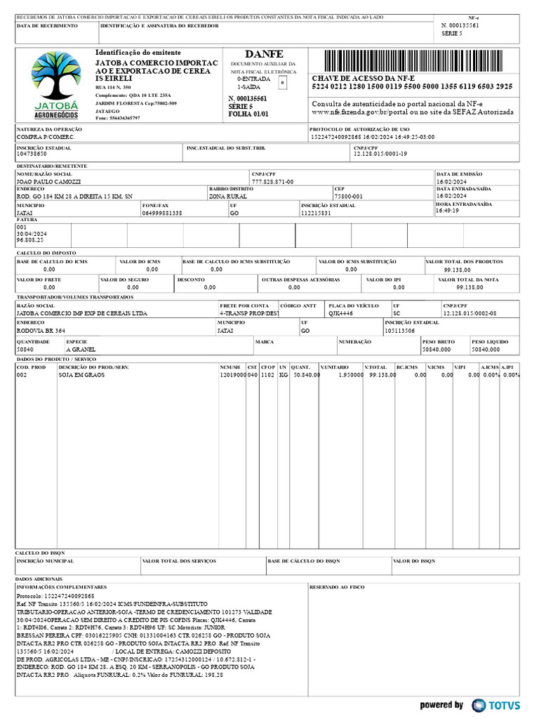 002 SOJA EM GRAOS 12019000 040 1102 KG 50.840,00 1,950000 99.138,00 0,00 0,00 0,00 0.00% 0.00%