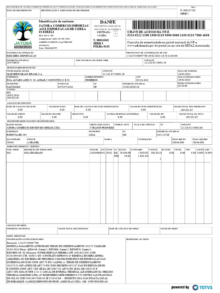 JATOBA COMERCIO IMP EXP DE CEREAIS LTDA 3-TRANSP PROP/REM 12.128.015/0002-08