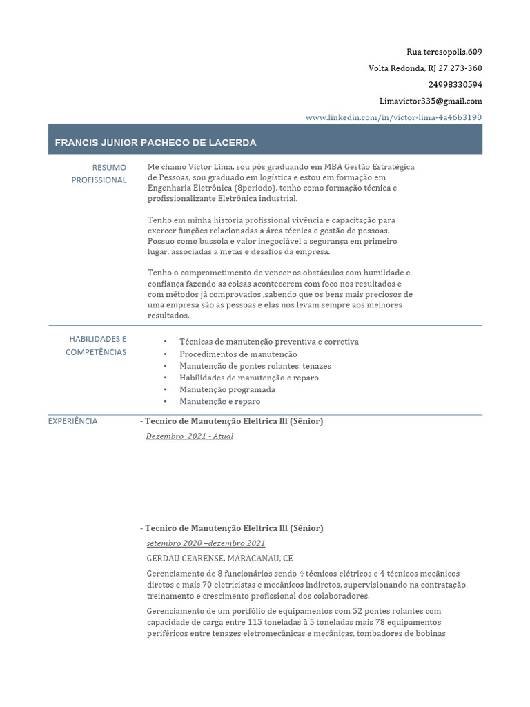 EXPERIÊNCIA - Tecnico de Manutenção Eleltrica lll (Sênior)
